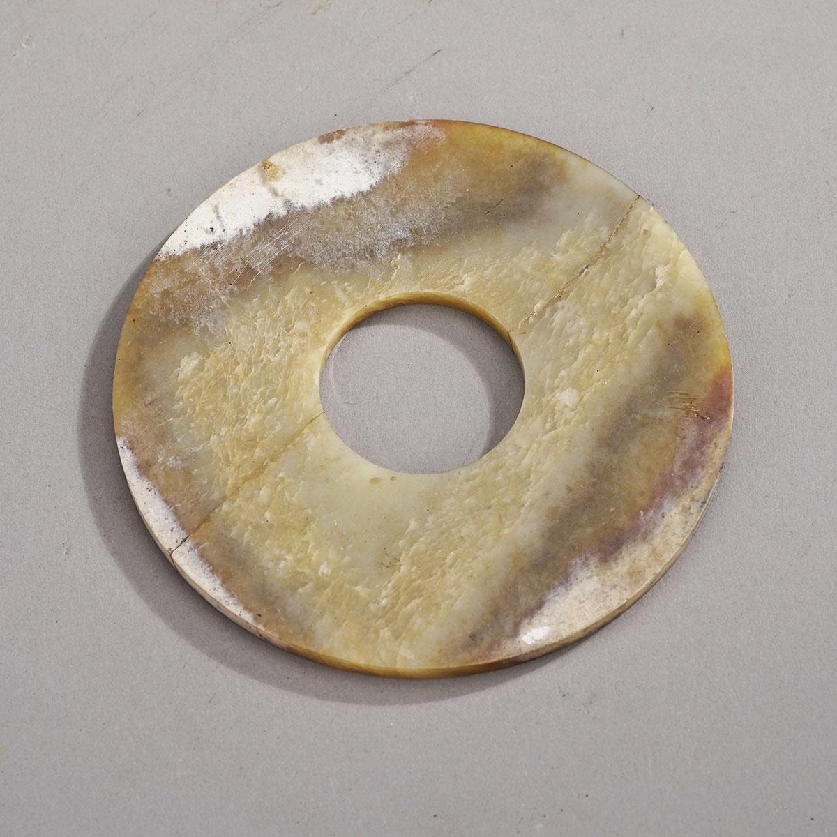 Plain without patterns; in the middle, a crack has been repaired, while a corner is missing; it seems like jade with yellow color and several ice cracks.
